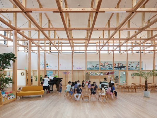 家型の木架構が横断する、レイモンド甲賀こども園