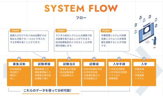本サービスは、専門的なナレッジと最先端の技術を活用し、生徒募集から入学手続きまで幅広く業務効率化します。パッケージシステムであることから低コストでのシステム運用を可能にするとともに、カスタマイズ実装も可能な柔軟性の高いサービスとして提供いたします。