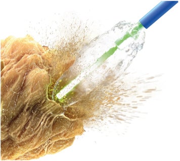 で、最初のレーザーが水中で道を作り、続くレーザーで効率よく結石を破砕します。