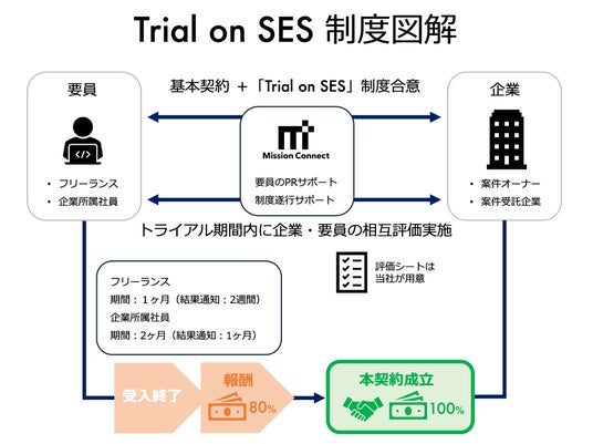 株式会社ミッションコネクト(本社:東京都品川区、代表取締役:太田光一)は、SES(システムエンジニアリングサービス)業界における、案件と人材のミスマッチや応募条件の縛りによる双方の機会損失の解消、また要員の挑戦の機会を後押しすべく、新しいマッチング制度『Trial on SES(トライアル・オン・エスイーエス)』を2025年7月7日より提供開始します。本制度は、企業と要員が1~2ヶ月間の実務稼働を通じて相互理解と適応を確認し、納得のうえで成約判断を行える仕組みです。