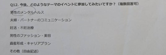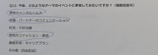 アンケートでは「男性のメンタルヘルス」(22件)や「夫婦・パートナーのコミュニケーション」(10件)をテーマにしたイベント開催への要望が多く寄せられました。