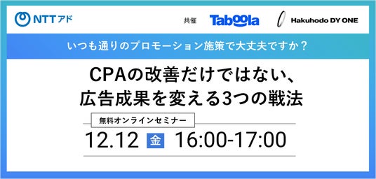株式会社NTTアドは、Taboola Japan株式会社・株式会社Hakuhodo DY ONEと共催で、2025年12月12日(金)にウェビナー『いつも通りのプロモーションで大丈夫ですか?CPAの改善だけではない、広告成果を変える3つの戦法』を開催いたします。