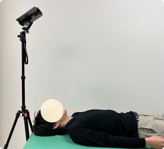ミリ単位で計測するため、手ブレを防ぐ必要があります。三脚やスタンドを用いて、頭上にBREVIをインストールしたiPad Pro(第4世代以降に対応)を固定し、仰臥位の状態で1分撮影します(撮影時間は30秒~120秒で設定が可能)。詳細はこちらをご覧下さい。