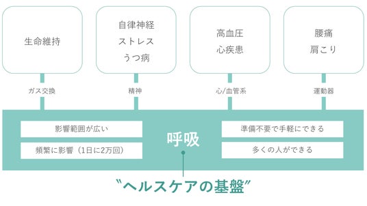 昨今、ヨガ、整体院、リハビリといった生活者の身近な場面で、からだの専門家による呼吸状態の観察や介入が実施されています。また、実は研究としてもストレス、高血圧、自律神経、睡眠、腰痛などの様々な症状との関連性が指摘されています。このことから我々は、呼吸は「ヘルスケアの基盤」と位置付けられると考えています。