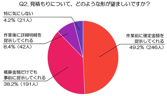 - 一方で、「作業後に詳細明細を提示してくれる」(8.4%)は比較的少なく、費用の把握が作業後になる形式は不安を十分に解消できないと感じられているようです。また「特に気にしない」(4.2%)はごく少数で、多くの利用者が費用の透明性を重視している点がはっきり表れた結果といえます。