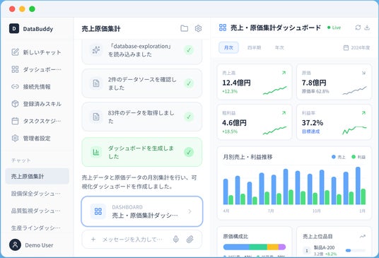 DataBuddyは、企業に眠るデータを「会話で使える資産」に変える対話型データ活用AIエージェントです。ユーザーは日本語のチャットで質問するだけで、基幹システム、業務システム、データベース、Excel・CSVファイルなど、社内の接続可能なあらゆるデータソースを横断的に探索・集計・出力・可視化できます。