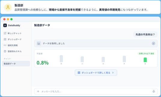 株式会社DENCYU(本社:福岡県、代表取締役:田中匠美、以下「DENCYU」)は、創業1周年となる2026年2月5日より、対話型データ活用AIエージェント「DataBuddy(データバディ)」の正式提供を開始いたします。DataBuddyは、日本語での自然な会話だけで社内データの探索・集計・可視化を実現し、SQLやBIツールの専門スキルがなくても誰でもデータ活用ができる環境を提供します。先行導入として、5社限定の3ヶ月間PoCプログラム(初期費用無料、月額10万円~)も同時に募集開始します。