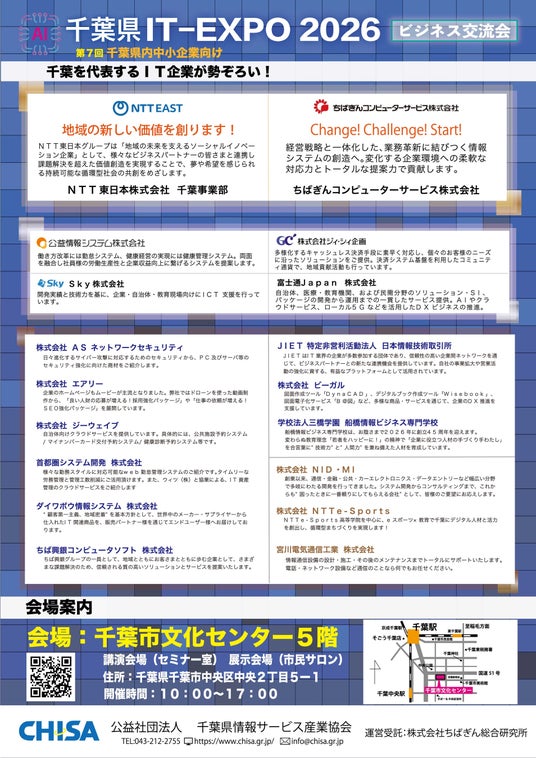 第7回千葉県内中小企業向けビジネス交流会開催 公益社団法人 千葉県情報サービス産業協会(CHISA)(千葉県千葉市美浜区、会長 宮城和彦)は、2026年2月6日(金)に「千葉県IT-EXPO2026 ー第7回千葉県内中小企業向けビジネス交流会ー」を千葉市文化センター5階にて開催します。