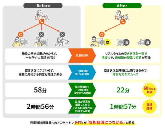 夜間休日に実証実験としてKAKERUを導入した結果、打診開始から一時保護先決定までに要する時間は、平均58分から22分へと大幅に短縮されました。
