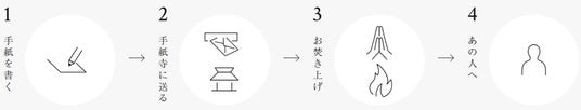 概要:「手紙処 浜町」「手紙処 船橋」「手紙処 江戸川」「手紙処 オンライン」で「手紙寺郵便レターセット」をご購入のうえ、各「手紙処」に設置した白い「Tポスト」または通常のポストに投函いただくと「手紙寺」に手紙が届き、お焚き上げを行います。終了後はお焚き上げ証明書が発行されます。