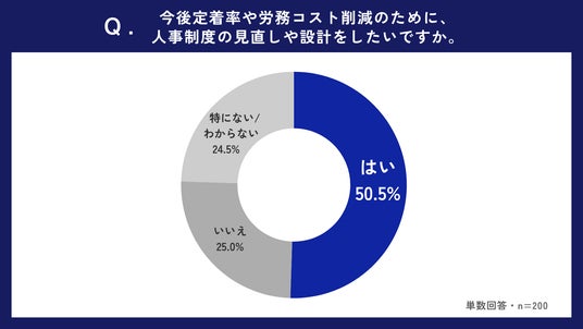「Q8.人事評価制度を設けていますか」という問いに「設けている」と回答したのはわずか9.5%にとどまった一方で、「Q9.今後定着率や労務コスト削減のために、人事制度の見直しや設計をしたいですか」という問いに対しては、「行いたい」と回答した声が50.5%にのぼっています。現場では制度構築の必要性を十分に認識しながらも、マンパワー・ノウハウの不足によって実行に移せていないケースが大多数であることが明らかになりました。