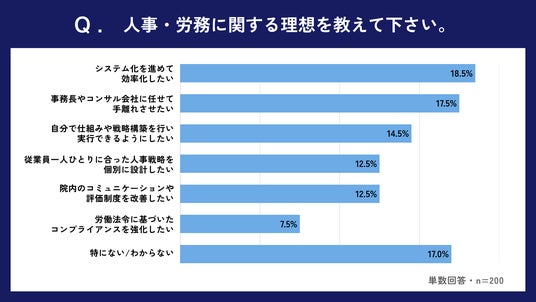 「Q10.人事・労務に関する理想を教えてください」という質問に対しては、「システム化を進めて効率化したい」が18.5%、「事務長やコンサル会社に任せて手離れさせたい」が17.5%と上位を占めました。リソースが不足している院内で解決するのは構造上難しい側面があり、外部専門人材に任せ、さらなる効率化を図りたいというニーズが存在していることが伺えます。