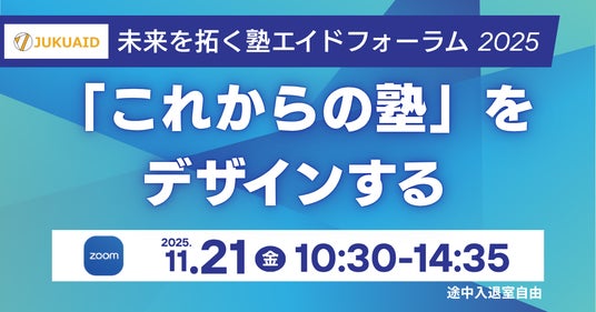 「塾の成功と生徒の成長を両立させ、より広く価値を提供したい」という目的・志のもとに主体的に集まり、相互に協力して地域教育に貢献するための塾・スクール経営の組織である塾エイド(運営法人:株式会社インサイト・ジャパン、代表取締役社長:鴨志田順)は、2025年11月21日(金)に「未来を拓く塾エイドフォーラム2025 ~「これからの塾」をデザインする~」を開催いたしますのでお知らせいたします。