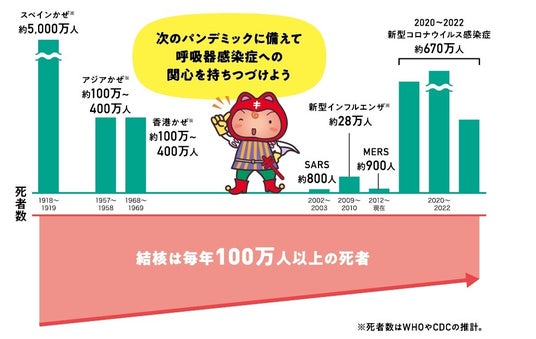 日本は官民一体での結核対策が奏功し、2021年から結核低蔓延国となりました。しかし、現在も毎年1万人以上が結核を発病し、約1,500人が命を落とす呼吸器感染症であることに変わりはありません。また、呼吸器感染症はこれまでも世界的なパンデミックの原因となってきました。新型コロナウイルス感染症の経験を経た今、呼吸器感染症への理解と備えは、日常的な啓発と社会的な合意形成の積み重ねによって支えられるべきものとして再認識されています。