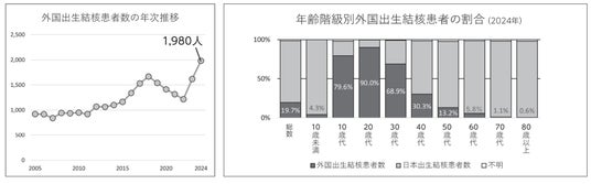 増)しました。特に若い年代では外国出生結核患者の割合が高く、10歳代が79.6%(103人中82人)、20歳代が90.0%(1,290人中1,161人)、30歳代が68.9%(591人中407人)でした。