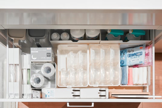 見せるもの以外は、シンク下の引き出しに整理整頓して片づけておきましょう!上から見た際に、重なり合うことなくすべてが見えることがベストです。数種類のゴミ袋なども重ねて収納せず、ケースに入れて引き出せるタイプのものを使用することをおすすめします。