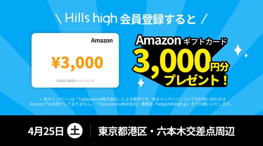 審査制マッチングアプリ「Hills high」は、東京・六本木にて初のオフライン入会イベントを実施します。当日は、その場で審査通過者に先着でAmazonギフトカード3,000円分を進呈いたします。