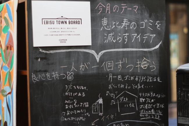 COMMON EBISU「感想文庫」本棚横には人の気持ちやアイデアを可視化する「EBISU TOWN BOARD」という黒板が設置されており毎月変わるお題に沿って日々利用者が意見やアイデアの書き込みを行っています。アイデアや意見が集まった段階でそのテーマに沿ったタウンミーティングを毎月開催されます。タウンミーティングでは行政・住民・第二の住民(オフィスワーカー)・テーマの有識者が立場関係なくざっくばらんな意見を交換し具現化できるアイデアを実行まで落とし込みます。