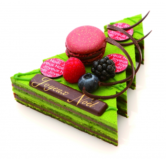 風味豊かな抹茶のバタークリームとなめらかなガナッシュのアンサンブル。ビスキュイに染みこんだキルシュが大人の味わいをプラスし、サパン(モミの木)のフォルムが素敵なクリスマスを演出します。