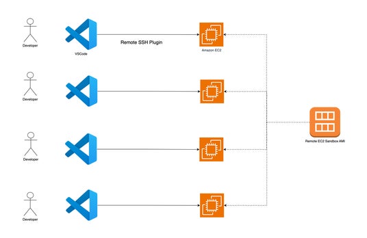 本AMIは、開発者ごとにAmazon EC2インスタンスを割り当てることで、誰もが同一のクラウド開発環境にアクセスできるように設計されています。VSCode等のRemote SSH機能を活用することで、ローカルPCに依存せず、共通の開発環境でスムーズに作業を進めることが可能です。