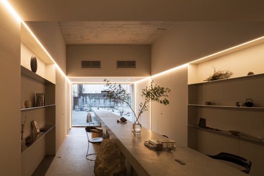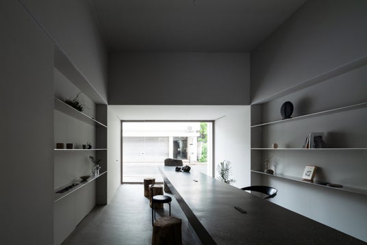 1階ギャラリーのファサードは奥まで見渡せる全面ガラスとし、奥の外部へ突き抜けた長いテーブルを設けることで、外部である都市から、天井高さに変化をつけた内部を経て奥の外部へとシームレスに連続していく。