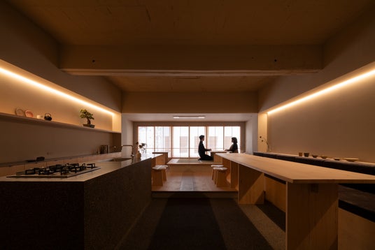 2階には上下階に対し、迅速な対応ができるようオフィス空間を設け、3階では、1階のパブリックな空間に対し、ショールームとしても利用することから、プライベートな生活空間が想起できるように設えている。立ち話しもできる土間空間、靴を脱ぎダイニングのように使える空間、天井高さを抑えた座卓の空間と、奥へ行くにつれその親密さが濃くなるように階段状に床高さを変え、ワンフロア内での変化と下階からの連続性をつくり出した。