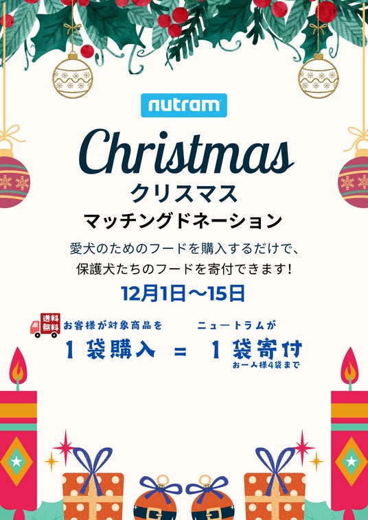 2024年4月から日本で発売開始された、世界30カ国以上で愛用される、天然素材にこだわったプレミアムドッグフード「Nutram(ニュートラム)」が、保護犬支援を目的とした「クリスマスマッチングドネーション」を開始しました。2025年12月1日から15日までの間、Nutram(ニュートラム)と提携する保護団体を通じて公式サイトにアクセスしてドッグフードを購入すると、購入者が選んだ商品と同じ内容を、Nutram(ニュートラム)から各保護団体へ寄付する仕組みです。愛犬のごはんを購入するだけで、保護犬へのサポートにつながる“参加しやすい社会貢献”を実現します。