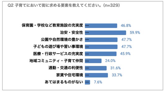 治安(59.9%)・自然環境(47.7%)・教育施設(46.8%)が子育てにおける最重要ポイントに。その中でも子育て世帯が街に求める条件として最も多く選ばれたのは「治安の良さ」です。