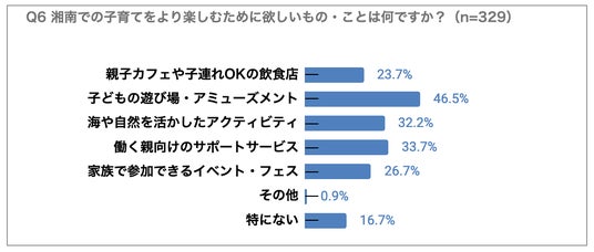 【Q6】今後もっとほしいものは「子どもの遊び場」(46.5%)、「働く親向けサポート」(33.7%)が上位に。── 共働き世帯の増加を反映したニーズが明確に