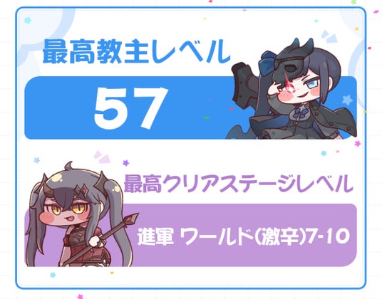 そうそう、教主たちも頑張ったじゃない! たった半月で、最高教主レベル「57」、最高クリアステージ「進軍 ワールド(激辛)7-10」だって! さっすが教主様ね!