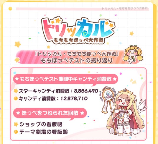 もちろん最初は、私が愛するキャンディのことからね! 今回のテストでは、なんと12,878,710個のキャンディと3,856,490個のスターキャンディが消費されました~(そんなにあったなら、もっと私にくれたっていいじゃない!)