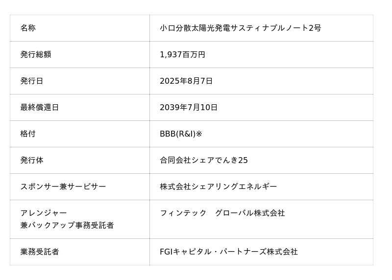 当社は、株式会社シェアリングエネルギー(本社:東京都港区、代表取締役:上村一行、以下、「シェアリングエネルギー」)との間で、シェアリングエネルギーが所有する2,485件の屋根置き太陽光発電設備による将来の売電債権等を裏付とするプロジェクトファイナンス「小口分散太陽光発電サスティナブルノート2号」を組成する業務委託契約を締結しました。また組成したプロジェクトファイナンスについて、株式会社格付投資情報センター(以下、「R&I」)からBBBの格付を取得した上で、19億円の資金調達が完了しましたのでお知らせいたします。