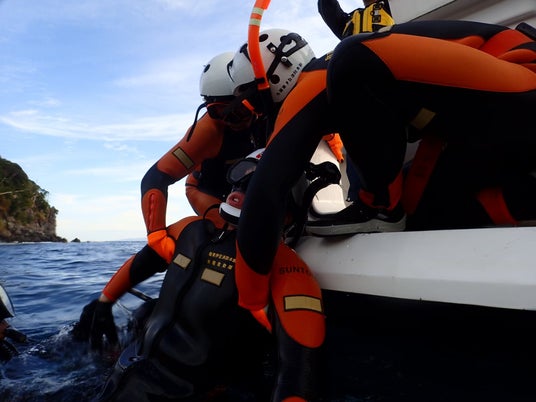 赤沢で開催した、海上保安庁、消防水難救助隊、認定NPO法人アンダーウオータースキルアップアカデミーの合同水難救助訓練の様子