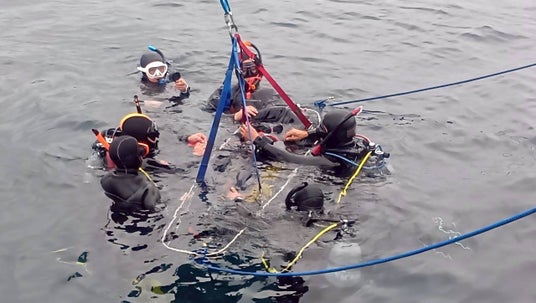 水中清掃で大きな鉄の部品を引き上げている様子(ロープワークも学びます)