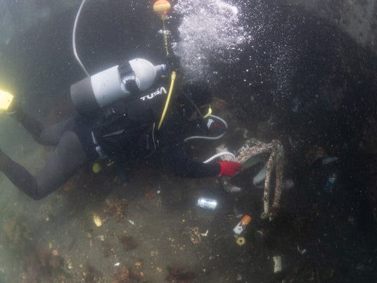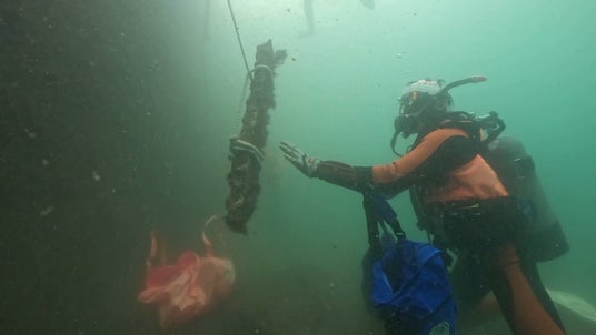 水中清掃をするダイバーの様子。改定はヘドロや泥がたまっており、中世浮力が必須。