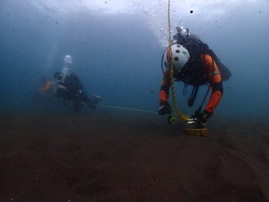 水中で安全に物や人を探す、ラインサーチ訓練をしている様子
