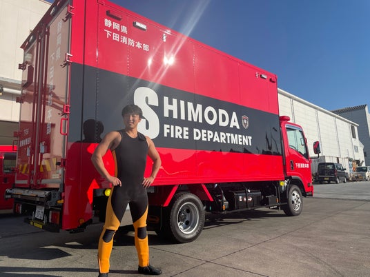 2025年12月に開催した、静岡県下田市下田港での水中清掃に消防トラックで登場した様子。(写真:静岡県下田消防本部の消防士)