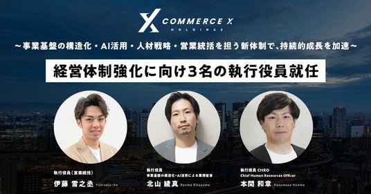「新しいコマースのあたりまえを作る」をビジョンに掲げるCommerceXホールディングス株式会社(本社:大阪府吹田市、代表取締役:佐藤秀平、以下「CommerceX HD」)は、2026年4月1日付で、北山綾真、本間和章、伊藤雪之丞の3名を執行役員に任命したことをお知らせいたします。