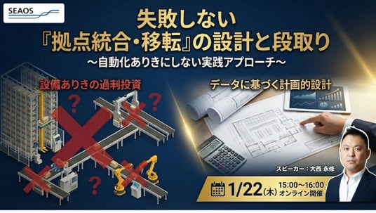 デジタルロジスティクスで企業のサプライチェーン変革を支援するシーオス株式会社(本社:東京都中央区、代表取締役:松島 聡、以下シーオス)は、2026年1月22日(木)15:00-16:00に、物流拠点の統合・移転を検討されている企業様を対象としたオンラインセミナー「失敗しない『拠点統合・移転』の設計と段取り ~自動化ありきにしない実践アプローチ~」を開催いたします。