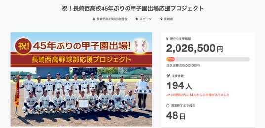 株式会社マグノリア・スポーツマネジメントは、2026年1月30日よりクラウドファンディングサイト「CAMPFIRE」にて開始された、第98回選抜高校野球大会に「21世紀枠」で出場する長崎西高校野球部を支援するためのプロジェクト(プロジェクトオーナー:長崎西高野球部後援会)をサポートしております。開始から約14日間で200万円を超える多大なご支援をいただいており、目標金額2,000万円達成に向けてさらなる支援の輪を広げてまいります。