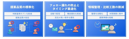 担当者が手作業で行ってきた情報整理・候補抽出・アプローチ判断をシステム側に移すことで、業務負担の軽減と提案品質の向上を図ります。なお、主要な機能は以下の通りです。