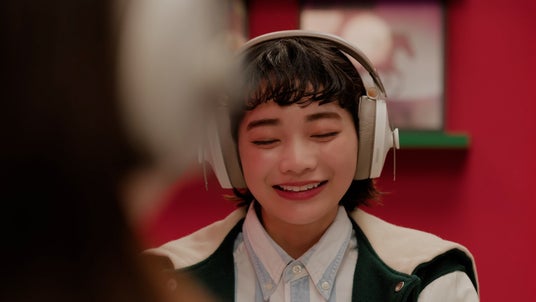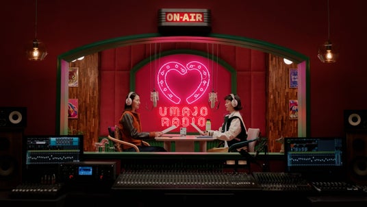 ガーリーなラジオブースから、長澤まさみさんと見上愛さんがパーソナリティを務めるラジオ番組「UMAJO RADIO」を放送中。ヘッドフォンをした長澤さんと見上さんが、仲むつまじく番組をお届けしています。