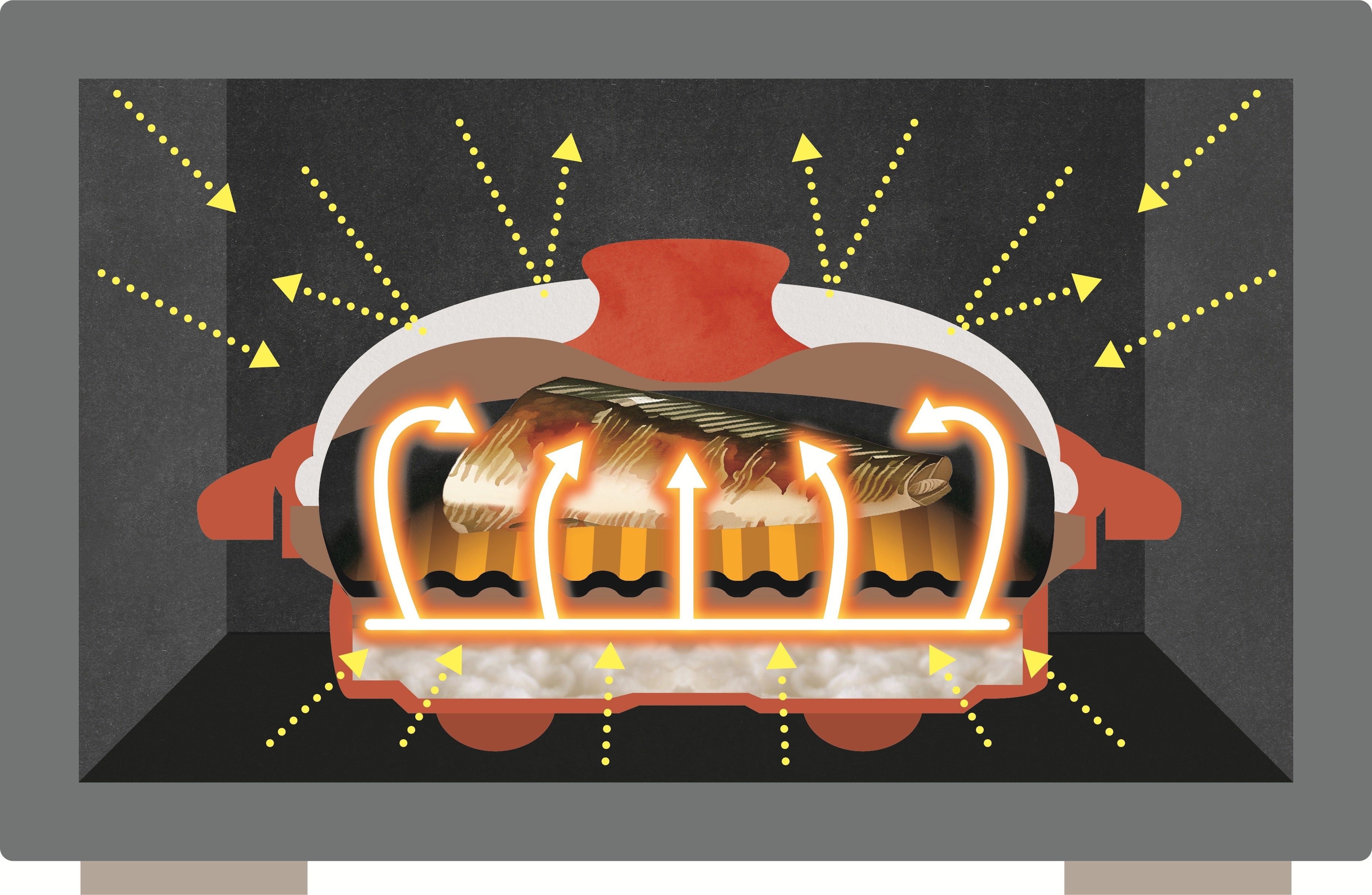 レンジメートの最大の特徴は、メーカー独自開発の特殊な発熱体がマイクロ波に反応して発熱し、300℃以上まで温度が上昇する点にあります。