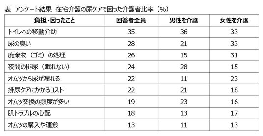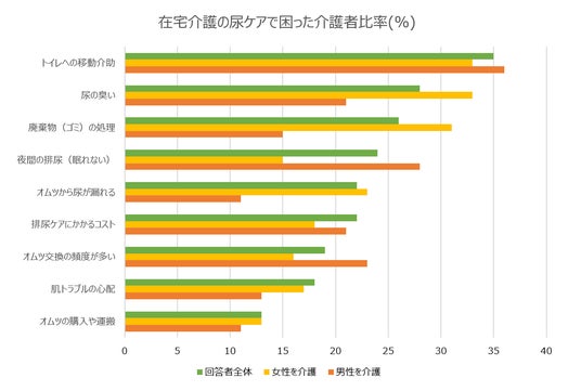 - 在宅介護した方が感じた排尿ケアにおける負担や困ったこと(最大3つの選択)は、回答者全体では「トイレへの移動介助」が35%と最も多く、次いで「尿の臭い」が28%、「廃棄物(ゴミ)の処理」が26%でした。女性を介護した人では、「トイレへの移動介助」と「尿の臭い」が33%と最も多く、次いで「廃棄物(ゴミ)の処理」が31%でした。一方、男性を介護した人では、「トイレへの移動介助」が36%と最も多いのは同じですが、2番目に「夜間の排尿(夜中の対応で眠れない)」が28%、3番目に「オムツ交換の頻度が多い」が23%となっています。これは、男性を在宅介護する場合の排尿ケアにおいて、トイレへの移動介助に次いで、尿の臭いや廃棄物の処理よりも、夜間の排尿ケアで眠れないことやオムツ交換が大変だということを示しています。