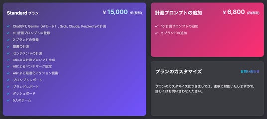 これまで分かれていたLiteプランおよびBusinessプランを統合し、月額15,000円(税別)で5大生成AI(ChatGPT、Gemini、Grok、Claude、Perplexity)を横断計測できる国内でも稀有な価格設計です。