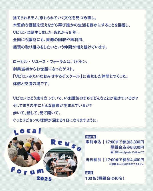 株式会社 ReBuilding Center JAPAN(所在地:長野県諏訪市/共同代表:東野華南子・東野唯史)は、2025年10月14日(火)に「Local Reuse Forum 2025」を開催いたします。