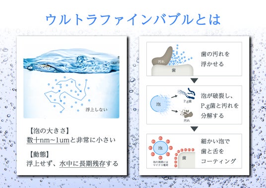 ウルトラファインバブルとは、直径が1マイクロメートル(1mmの1000分の1)未満の非常に微細な泡のことで、浮上せずに水中に長期間安定して存在する特性があります。肉眼では見えないこの小さな泡には、以下のような口腔ケアにおけるメリットが期待されています。
