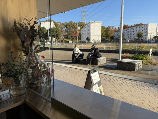 店内から見た団地の景色