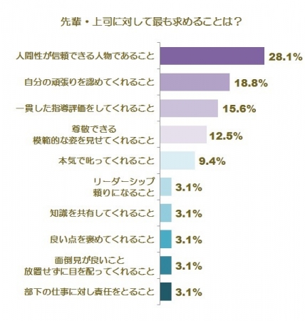 これは先輩や上司に求めることについて調査したもので、今年度から後輩を持った、役職に就いたという方や、後輩や部下との関わり方に悩む方にとって、参考になる内容となっています。