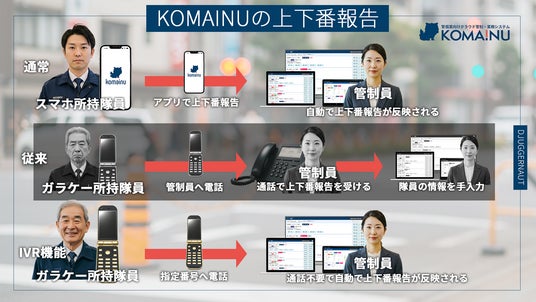 KOMAINUは、契約管理・管制業務・上下番管理・給与・請求・帳簿生成まで、警備業のバックオフィス業務を一元管理できるオールインワンプラットフォームです。今回の機能追加により、スマートフォンを所持していない隊員でも電話一本で上下番(出退勤)の打刻が可能となり、現場対応の幅がさらに広がりました。音声ガイダンスにはタレントの霜月めあ氏を起用し、親しみやすく分かりやすい操作環境を提供しています。